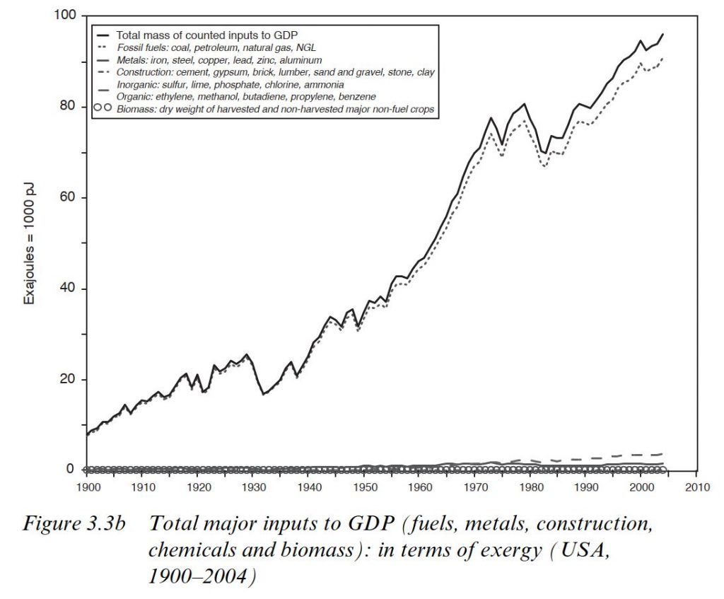 Een bron over de hedendaagse rol die natuurlijke hulpbronnen spelen bij (economische) vooruitgang is het boek ‘The economic growth engine: How energy and work drive material prosperity’ van Robert Ayres & Benjamin Warr. De onderstaande figuur over de fysieke inputs voor de economische ontwikkeling van de VS komt uit dit boek (p. 73). Zoals blijkt uit dit plaatje zijn fossiele brandstoffen met afstand de belangrijkste fysieke input geweest. De inzet van fossiele brandstoffen in combinatie met de inzet van technologie die ervoor zorgt dat we deze brandstoffen steeds efficiënter gebruiken, verklaart volgens Ayres & Warr grotendeels de ontwikkeling van moderne economieën in de afgelopen eeuw.
